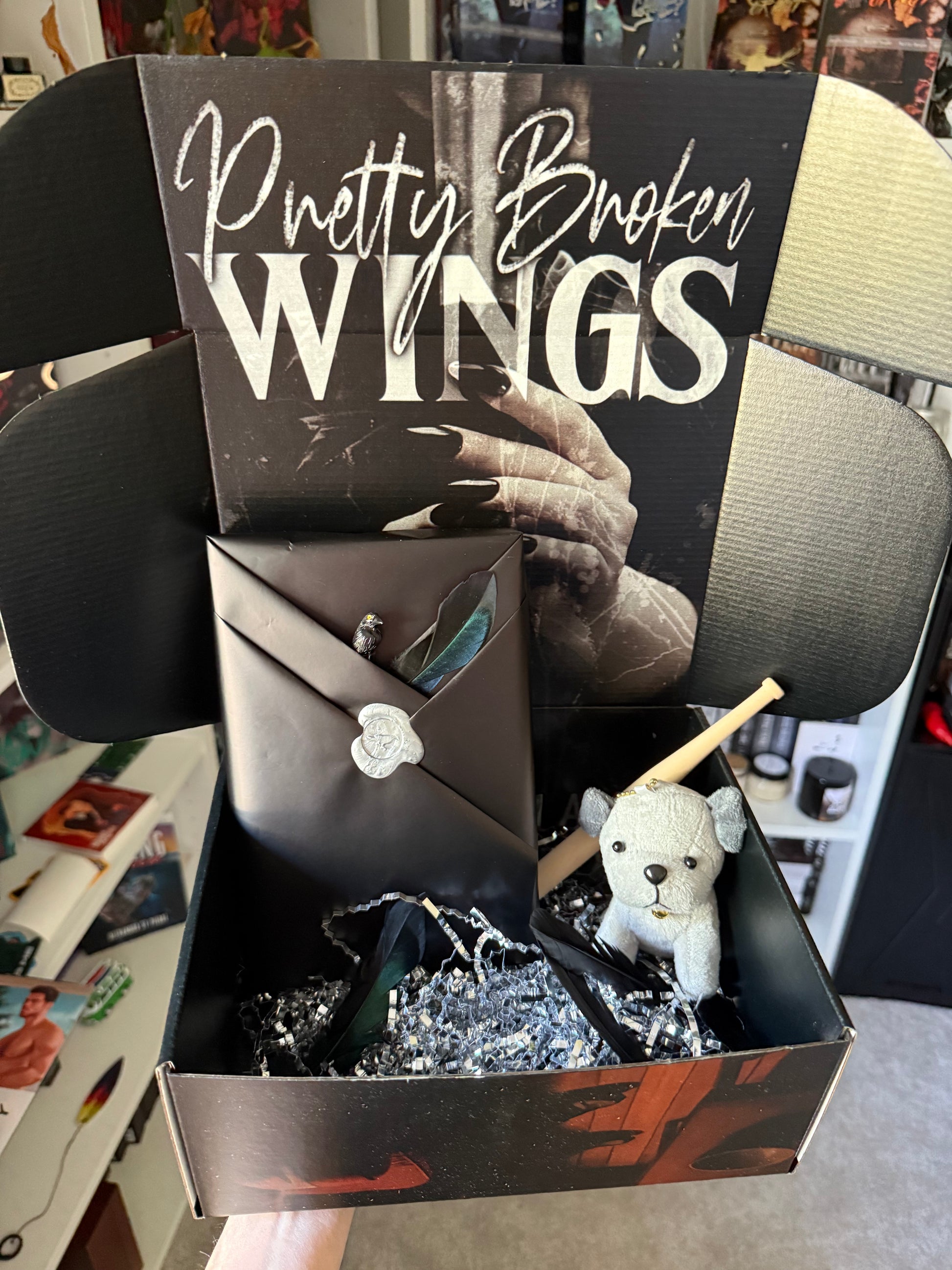 This is the PR Box for Pretty Broken Wings! It includes a signed copy of PBW plus a plush Buddy, a baseball bat, and a miniature Raven.